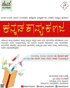 ಇದೇ ಫೆಬ್ರವರಿ ೦೩ರಂದು ಸಂಜೆ ೬.೩೦ಕ್ಕೆ ಮೈಸೂರಿನ ರಾಮಕೃಷ್ಣ ನಗರದಲ್ಲಿರುವ ನಟನ ರಂಗಶಾಲೆಯಲ್ಲಿ ೨೦೨೩-೨೪ನೇ ಸಾಲಿನ ರಂಗಭೂಮಿ ಡಿಪ್ಲೋಮಾ ವಿದ್ಯಾರ್ಥಿಗಳ ಎರಡನೇ ಅಭ್ಯಾಸೀ ಪ್ರಯೋಗ, ಹೆಸರಾಂತ ರಂಗಕರ್ಮಿ ಡಾ.ಶ್ರೀಪಾದ ಭಟ್ ನಿರ್ದೇಶನದ ‘ಕನ್ನಡ ಕಾವ್ಯಕಣಜ’ ನಾಟಕವನ್ನು ಪ್ರದರ್ಶನಗೊಳಿಸಲಿದ್ದಾರೆ ಎಂದರು.