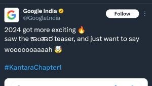 “2024 ಮತ್ತಷ್ಟು ಕಾತರತೆಯನ್ನು ಪಡೆದುಕೊಂಡಿದೆ. ಈಗ ತಾನೇ ಕಾಂತಾರ ಫಸ್ಟ್ಲುಕ್ ಟೀಸರ್ ನೋಡಿದೆ ಹಾಗೂ ವೋಹ್….. ಎಂದು ಕೂಗಬೇಕೆನಿಸುತ್ತಿದೆ” ಎಂದು ಗೂಗಲ್ ಇಂಡಿಯಾ ಬರೆದುಕೊಂಡಿದೆ. ಕನ್ನಡ ಚಿತ್ರವೊಂದರ ಬಗ್ಗೆ ಗೂಗಲ್ ಈ ರೀತಿಯ ಟ್ವೀಟ್ ಮಾಡಿರುವುದನ್ನು ಕಂಡು ಕನ್ನಡಿಗರು ಹಾಗೂ ಕಾಂತಾರ ಚಿತ್ರತಂಡ ಸಂತಸ ವ್ಯಕ್ತಪಡಿಸಿದ್ದಾರೆ.