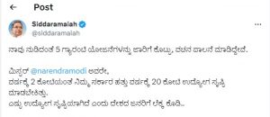 ನಾವು ನುಡಿದಂತೆ 5 ಗ್ಯಾರಂಟಿ ಯೋಜನೆಗಳನ್ನು ಜಾರಿಗೆ ಕೊಟ್ಟು, ವಚನ  ಪಾಲನೆ ಮಾಡಿದ್ದೇವೆ. ಮಿಸ್ಟರ್ ನರೇಂದ್ರ ಮೋದಿ ಅವರೇ, ವರ್ಷಕ್ಕೆ 2 ಕೋಟಿಯಂತೆ ನಿಮ್ಮ ಸರ್ಕಾರ ಹತ್ತು ವರ್ಷಕ್ಕೆ 20 ಕೋಟಿ ಉದ್ಯೋಗ ಸೃಷ್ಟಿ ಮಾಡಬೇಕಿತ್ತು. ಎಷ್ಟು ಉದ್ಯೋಗ ಸೃಷ್ಟಿಯಾಗಿದೆ ಎಂದು ದೇಶದ ಜನರಿಗೆ ಲೆಕ್ಕ ಕೊಡಿ ಎಂದು ಪ್ರಶ್ನಿಸಿದ್ದಾರೆ.