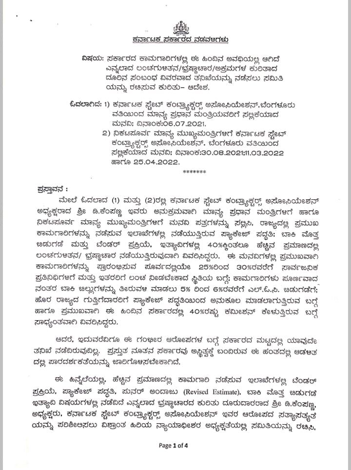 ಬೆಂಗಳೂರು : ಬಿಜೆಪಿ ಸರಕಾರದ ಅವಧಿಯಲ್ಲಾದ ಕಾಮಗಾರಿಗಳು,ಟೆಂಡರ್, ಪ್ಯಾಕೇಜ್ ಗಳು,ಪುನರ್ ಅಂದಾಜು, ಹೆಚ್ಚುವರಿ ಅಂದಾಜು, ಬಾಕಿ ಬಿಡುಗಡೆ ಬಗ್ಗೆ ಗುತ್ತಿಗೆದಾರ ಸಂಘದ ಅಧ್ಯಕ್ಷ ಡಿ.ಕೆಂಪಣ್ಣ ಮಾಡಿದ ಆರೋಪಗಳ ತನಿಖೆಗೆ ಹೈಕೋರ್ಟ್ ನಿವೃತ್ತ ನ್ಯಾಯಮೂರ್ತಿ ಎಚ್.ಎನ್. ನಾಗಮೋಹನ್ದಾಸ್ ಅಧ್ಯಕ್ಷತೆಯಲ್ಲಿ ಸಮಿತಿ ರಚಿಸಿ ರಾಜ್ಯ ಸರ್ಕಾರ ಗುರುವಾರ ಆದೇಶ ಹೊರಡಿಸಿದೆ.