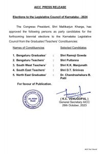 ಬೆಂಗಳೂರು : ಮುಂಬರುವ ಕರ್ನಾಟಕ ವಿಧಾನ ಪರಿಷತ್ ಚುನಾವಣೆಗೆ ಕಾಂಗ್ರೆಸ್ ತನ್ನ ಅಭ್ಯರ್ಥಿಗಳ ಪಟ್ಟಿ ಬಿಡುಗಡೆ ಮಾಡಿದೆ. ವಿಧಾನ ಪರಿಷತ್ನ ಒಟ್ಟು 5 ಸ್ಥಾನ ಬೆಂಗಳೂರು ಪದವೀಧರ ಕ್ಷೇತ್ರ, ಬೆಂಗಳೂರು ಶಿಕ್ಷಕರ ಕ್ಷೇತ್ರ, ನೈಋತ್ಯ ಶಿಕ್ಷಕ್ಷರ ಕ್ಷೇತ್ರ, ಆಗ್ನೇಯ ಶಿಕ್ಷಕ್ಷ ಮತ್ತು ಈಶಾನ್ಯ ಪದವೀಧರ ಕ್ಷೇತ್ರಗಳಿಗೆ ಅಭ್ಯರ್ಥಿಗಳ ಹೆಸರು ಘೋಷಿಸಿದೆ.