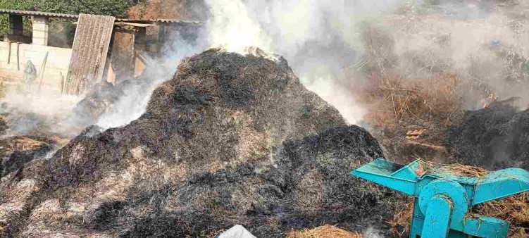 ಯಂತ್ರದ ಸಹಾಯದಿಂದ ಭಾನುವಾರ ಸಂಜೆ ಗ್ರಾಮದ ಮಾಜಿ ಸೈನಿಕ ಕುಲ್ಲಚೆಟ್ಟಿ ನಾಣಯ್ಯ ಎಂಬವರ ಮನೆಯಂಗಳದಲ್ಲಿ ಕಾರ್ಮಿಕರು ಭತ್ತ ಒಕ್ಕಲು ಮಾಡುತ್ತಿದ್ದ ಸಂದರ್ಭದಲ್ಲಿ ಆಕಸ್ಮಿಕವಾಗಿ ಬೆಂಕಿ ತಗಲಿದ್ದು, ಅಪಾರ ಪ್ರಮಾಣದ ಭತ್ತ ಮತ್ತು ಹುಲ್ಲು ನಾಶವಾಗಿದೆ. ಜೊತೆಗೆ ಶೆಡ್ನಲ್ಲಿದ್ದ ಕಾರು ಕೂಡ ಬೆಂಕಿಯಿಂದ ಹಾನಿಗೊಳಗಾಗಿದೆ. ತಕ್ಷಣ ಮಾಹಿತಿ ತಿಳಿದ ಸ್ಥಳೀಯರು ಸ್ಥಳಕ್ಕೆ ಧಾವಿಸಿ, ಬೆಂಕಿಯನ್ನು ನಂದಿಸಿ ಹೆಚ್ಚಿನ ಅಪಾಯವನ್ನು ತಪ್ಪಿಸಿದರು.