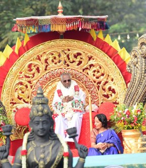 87ನೇ ನುಡಿ ಜಾತ್ರೆಯ ಸಮ್ಮೇಳನಾಧ್ಯಕ್ಷ ಗೊ.ರು.ಚನ್ನಬಸಪ್ಪ ಅವರನ್ನು ಅರಮನೆ ದರ್ಬಾರ್ ಸಿಂಹಾಸನವನ್ನೊಳಗೊಂಡ ವಿಶೇಷ ರಥದ ಮೂಲಕ ಮೆರವಣಿಗೆ ನೆರವೇರಿಸಲಾಗಿದೆ. ಸಮ್ಮೇಳನಾಧ್ಯಕ್ಷರ ಮೆರವಣಿಗೆಗೆ ರಾಜ ವಂಶಸ್ಥೆ ಪ್ರಮೋದಾದೇವಿ ಒಡೆಯರ್ ಚಾಲನೆ ನೀಡಬೇಕಿತ್ತು. ಆದರೆ ಅವರ ಗೈರು ಹಾಜರಿಯಿಂದ ಆದಿಚುಂಚನಗಿರಿ ಮಠದ ನಿರ್ಮಲಾನಂದನಾಥ ಸ್ವಾಮೀಜಿ ಅವರೇ ಮೆರವಣಿಗೆ ಚಾಲನೆ ನೀಡಿದ್ದಾರೆ. ಬಳಿಕ ಮೈಸೂರು ಪೊಲೀಸ್ ಬ್ಯಾಂಡ್ ಭಾಗವಹಿಸಿರುವುದು ಈ ಮೆರವಣಿಗೆಗೆ ಇನ್ನಷ್ಟು ಹೆಚ್ಚು ಮೆರಗು ನೀಡಿದಂತಾಗಿದೆ.