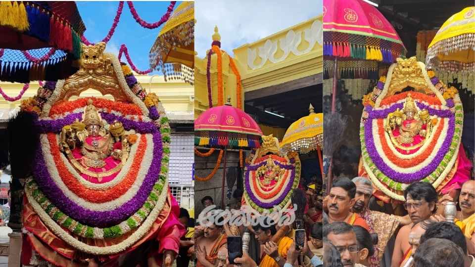 ಅರಮನೆ ಪೊಲೀಸ್ ಬ್ಯಾಂಡ್ ಜೊತೆಗೆ ಮಂಗಳವಾದ್ಯ, ಛತ್ರಿ, ಚಾಮರಗಳೊಂದಿಗೆ ನಡೆದ ಮೆರವಣಿಗೆಯನ್ನು ಸಹಸ್ರಾರು ಭಕ್ತರು ಕಣ್ತುಂಬಿಕೊಂಡರು.