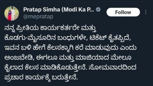 ಇನ್ನು ಟಿಕೆಟ್ ಘೋಷಣೆಯಾಗುವ ಮುನ್ನವೇ ಟಿಕೆಟ್ ಯಾರಿಗೆ ಸಿಕ್ಕರೂ ಪಕ್ಷದ ಪರ ಕೆಲಸ ಮಾಡುತ್ತೇನೆ ಎಂದು ಘೋಷಿಸಿದ್ದ ಪ್ರತಾಪ್ ಸಿಂಹ ಟಿಕೆಟ್ ಕೈತಪ್ಪಿದ ಬಳಿಕವೂ ಸಹ ಅದೇ ಮಾತುಗಳನ್ನು ಆಡಿದ್ದರು. ಇನ್ನು ಇಂದು ( ಮಾರ್ಚ್ 14 ) ಈ ಕುರಿತಾಗಿ ಮತ್ತೊಂದು ಟ್ವೀಟ್ ಮಾಡಿರುವ ಪ್ರತಾಪ್ ಸಿಂಹ “ನನ್ನ ಪ್ರೀತಿಯ ಕಾರ್ಯಕರ್ತರೇ ಮತ್ತು ಕೊಡಗು-ಮೈಸೂರಿನ ಬಂಧುಗಳೇ, ಟಿಕೆಟ್ ಕೈತಪ್ಪಿದೆ, ಇವನ ಬಳಿ ಹೇಗೆ ಕೆಲಸಕ್ಕಾಗಿ ಕರೆ ಮಾಡುವುದು ಎಂದು ಅಂಜಬೇಡಿ, ಈಗಲೂ ಮತ್ತು ಮಾಜಿಯಾದ ಮೇಲೂ ಕೈಲಾದ ಕೆಲಸ ಮಾಡಿಕೊಡುತ್ತೇನೆ. ಸೋಮವಾರದಿಂದ ಪ್ರಚಾರ ಕಾರ್ಯಕ್ಕೆ ಬರುತ್ತೇನೆ” ಎಂದು ಬರೆದುಕೊಂಡಿದ್ದಾರೆ.