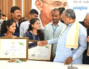 ಮೈಸೂರು: ರಾಜ್ಯ ಮಟ್ಟದ ಗಾಂಧಿ ಪ್ರಬಂಧ ಸ್ಪರ್ಧೆಯ ಪದವಿ ವಿಭಾಗದಲ್ಲಿ ತೃತೀಯ ಸ್ಥಾನ ಪಡೆದ ಮೈಸೂರು ಜೆ.ಎಸ್.ಎಸ್.ಕಾಲೇಜಿನ ತೃತೀಯ ಬಿ.ಎಸ್.ಸಿ ವಿದ್ಯಾರ್ಥಿನಿ ಕುಸುಮಾಬಾಯಿಗೆ ಮುಖ್ಯ ಮಂತ್ರಿ ಸಿದ್ದರಾಮಯ್ಯ ಅವರು ಪ್ರಶಸ್ತಿ ಪತ್ರ ಹಾಗೂ ನಗದು 11 ಸಾವಿರ ರೂಗಳನ್ನು ವಿತರಿಸಿದರು.