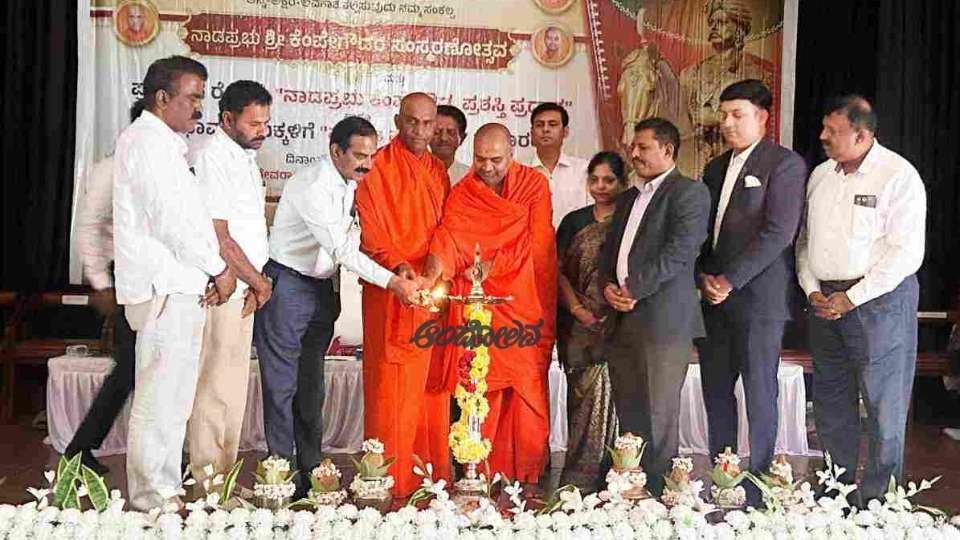 ಪಟ್ಟಣದಲ್ಲಿ ಒಕ್ಕಲಿಗ ಯುವ ಬ್ರಿಗೇಡ್ ವತಿಯಿಂದ ಹಮ್ಮಿಕೊಳ್ಳಲಾಗಿದ್ದ ನಾಡಪ್ರಭು ಕೆಂಪೇಗೌಡರ ಸಂಸ್ಮರಣೋತ್ಸವ ಮತ್ತು ಪ್ರಗತಿಪರ ರೈತರಿಗೆ ನಾಡಪ್ರಭು ಕೆಂಪೇಗೌಡ ಪ್ರಶಸ್ತಿ ಪ್ರದಾನ ಹಾಗೂ ಪ್ರತಿಭಾವಂತ ಮಕ್ಕಳಿಗೆ ಪ್ರತಿಭಾ ಪುರಸ್ಕಾರ ಸಮಾರಂಭವನ್ನು ಉದ್ಘಾಟಿಸಿ ಅವರು ಮಾತನಾಡಿದರು.