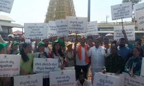 ಹಿಂದೂ ಜಾಗರಣ ವೇದಿಕೆಯ ಸಂಚಾಲಕ ವಸಂತ್ ಕುಮಾರ್‌ ನೇತೃತ್ವದಲ್ಲಿ ನಡೆದ ಪ್ರತಿಭಟನೆಯಲ್ಲಿ ಹಲವು ಮಂದಿ ಭಾಗಿಯಾಗಿದ್ದರು.