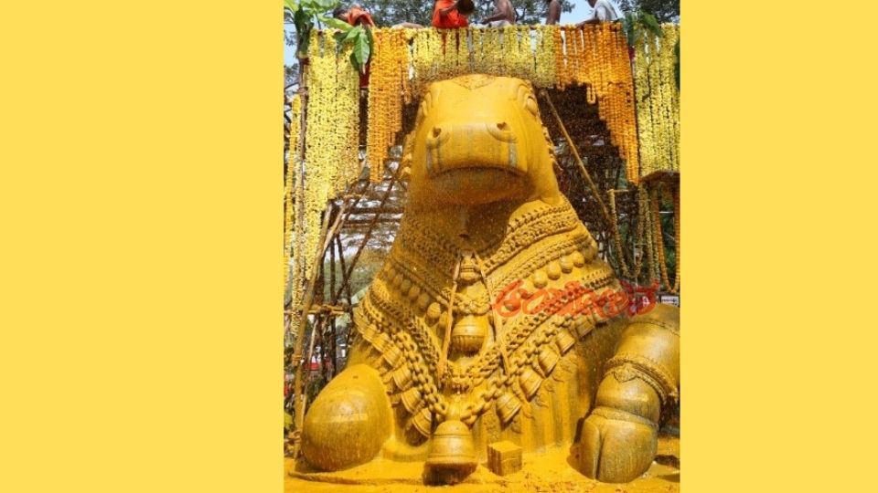 ಹಾಲು, ಮೊಸರು, ತುಪ್ಪ, ಜೇನು ತುಪ್ಪ, ಸಕ್ಕರೆ, ಕದಳಿ, ದ್ರಾಕ್ಷಿ, ಬೇಲ, ಖರ್ಜೂರ, ಸೌತೆಕಾಯಿ, ಎಳನೀರು, ಕಬ್ಬಿನ ಹಾಲು, ನಿಂಬೆ, ಎಳ್ಳೆಣ್ಣೆ, ಪಾಯಸ, ಗೋಽ, ಕಡಲೆ, ಹೆಸರು ಹಿಟ್ಟು, ದರ್ಬೆ, ಪತ್ರೆ, ಕೇಸರಿ ಹಾಗೂ ಪುಷ್ಪ ಸೇರಿದಂತೆ ವಿವಿಧ ಬಗೆಯ ದ್ರವ್ಯಗಳ ಅಭಿಷೇಕವನ್ನು ನಂದಿಗೆ ಎರೆಯಲಾಯಿತು. ಒಂದೊಂದು ಅಭಿಷೇಕದಲ್ಲೂ ವಿವಿಧ ಬಣ್ಣಗಳಲ್ಲಿ ನಂದಿ ಮೂರ್ತಿ ಕಂಗೊಳಿಸಿತು.