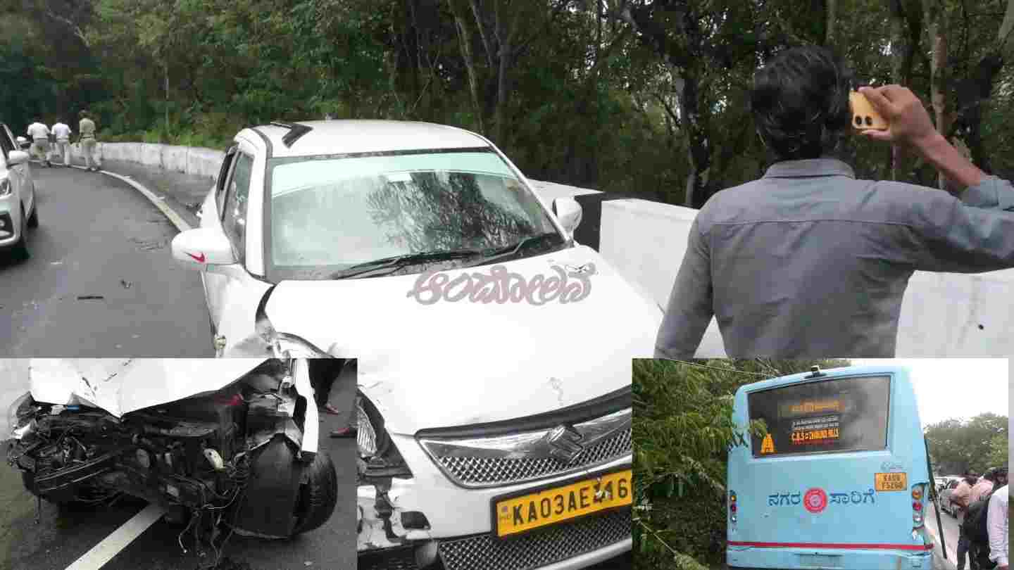 ಮೈಸೂರು: ಸಾರಿಗೆ ಬಸ್ ಹಾಗೂ ಎರಡು ಕಾರುಗಳ ನಡುವೆ ಸರಣಿ ಅಪಘಾತವಾಗಿರುವ ಘಟನೆ ಮೈಸೂರಿನ ಚಾಮುಂಡಿಬೆಟ್ಟದಲ್ಲಿ ಸಂಭವಿಸಿದ್ದು, 10ಕ್ಕೂ ಹೆಚ್ಚು ಮಂದಿ ಗಾಯಗೊಂಡಿದ್ದಾರೆ.