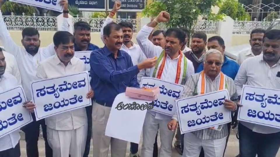 ಮೈಸೂರಿನ ಲೋಕಾಯುಕ್ತ ಕಚೇರಿ ಮುಂದೆ ಜಮಾಯಿಸಿದ ಕಾಂಗ್ರೆಸ್ ಕಾರ್ಯಕರ್ತರು, ಸತ್ಯ ಮೇವ ಜಯತೆ ಎಂದು ಬಿತ್ತಿ ಪತ್ರ ಹಿಡಿದು ಸಂಭ್ರಮಿಸಿದರು. ಕೆಪಿಸಿಸಿ ವಕ್ತಾರ ಎಂ.ಲಕ್ಷ್ಮಣ್, ಗ್ರಾಮಾಂತರ ಅಧ್ಯಕ್ಷ ಬಿ.ಜೆ.ವಿಜಯ ಕುಮಾರ್, ನಗರಾಧ್ಯಕ್ಷ ರಘು ಸೇರಿದಂತೆ ಅನೇಕ ಕೈ ಕಾರ್ಯಕರ್ತರು ಭಾಗಿಯಾಗಿ ಪರಸ್ಪರ ಸಿಹಿ ತಿನ್ನಿಸಿ ಖುಷಿಪಟ್ಟರು.