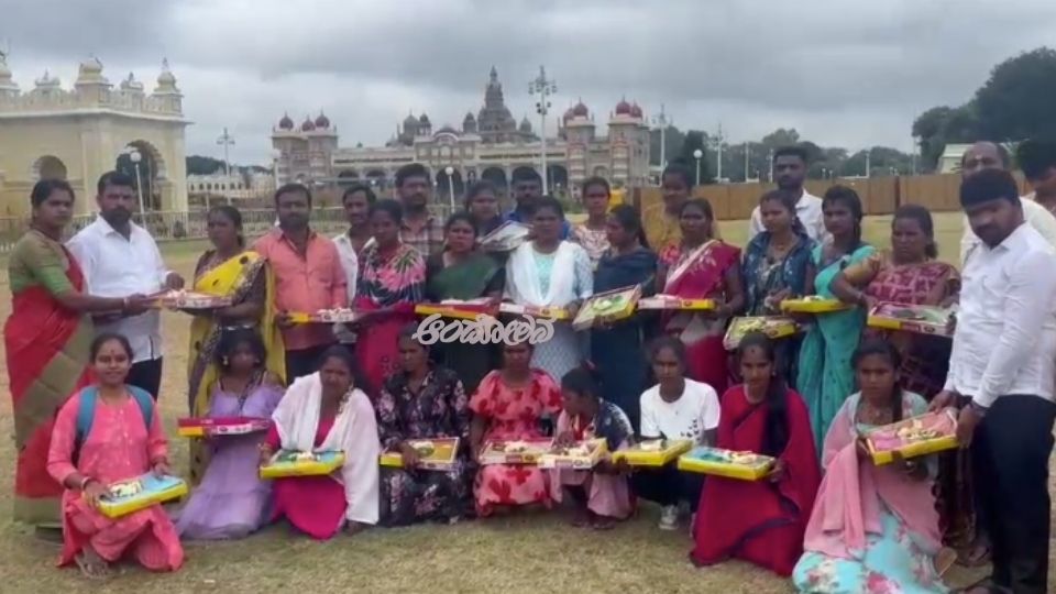 ವಿಶ್ವವಿಖ್ಯಾತ ನಾಡಹಬ್ಬ ಮೈಸೂರು ದಸರಾ ಮಹೋತ್ಸವದ ಅಂಗವಾಗಿ ಕಳೆದ ಒಂದೂವರೆ ತಿಂಗಳಿನಿಂದ ಅರಮನೆ ಆವರಣದಲ್ಲಿ ವಾಸ್ತವ್ಯ ಹೂಡಿರುವ ದಸರಾ ಗಜಪಡೆ ಮಾವುತರು ಹಾಗೂ ಕಾವಾಡಿಗರ ಕುಟುಂಬದ ಮಹಿಳೆಯರಿಗೆ ಅರಿಶಿಣ, ಕುಂಕುಮ, ಬಳೆ, ಸೀರೆ ನೀಡುವ ಮೂಲಕ ಬಾಗಿನ ವಿತರಣೆ ಮಾಡಲಾಯಿತು. ಈ ವೇಳೆ ಬಾಗಿನ ಸ್ವೀಕರಿಸಿ ಮಹಿಳೆಯರು ಖುಷಿಪಟ್ಟರು.