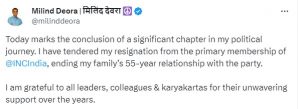 X ನಲ್ಲಿ, ದೇವ್ರ ಅವರು , “ಇಂದು ನನ್ನ ರಾಜಕೀಯ ಪ್ರಯಾಣದಲ್ಲಿ ಮಹತ್ವದ ಅಧ್ಯಾಯದ ಮುಕ್ತಾಯವನ್ನು ಸೂಚಿಸುತ್ತದೆ ಎಂದು ಹೇಳಿಕೊಂಡಿದ್ದಾರೆ.