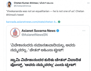 ಇಂದು ಸ್ವಾಮಿ ವಿವೇಕಾನಂದರ ಜಯಂತಿಯನ್ನು ಆಚರಿಸಲಾಗುತ್ತಿದೆ. ಈ ನಡುವೆ ಚೇತನ್ ಕುಮಾರ್ ಅಹಿಂಸಾ, ಸ್ವಾಮಿ ವಿವೇಕಾನಂದ ಸಮಾನತಾವಾದಿಯಲ್ಲ, ಅವರು ನಮ್ಮವರಲ್ಲ ಎಂದು ಟ್ವೀಟ್ ಮಾಡುವ ಮೂಲಕ ವಿವಾದದ ಕಿಡಿ ಎಬ್ಬಿಸಿದ್ದಾರೆ.