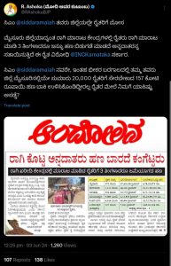 ಟ್ವೀಟ್ನಲ್ಲೇನಿದೆ?: “ಸಿಎಂ ಸಿದ್ದರಾಮಯ್ಯ ತವರು ಜಿಲ್ಲೆಯಲ್ಲೇ ರೈತರಿಗೆ ಮೋಸ. ಮೈಸೂರು ಜಿಲ್ಲೆಯಾದ್ಯಂತ ರಾಗಿ ಮಾರಾಟ ಕೇಂದ್ರಗಳಲ್ಲಿ ರೈತರು ರಾಗಿ ಮಾರಾಟ ಮಾಡಿ 3 ತಿಂಗಳಾದರೂ ಇನ್ನೂ ಹಣ ಬಿಡುಗಡೆ ಮಾಡದೆ ಅನ್ನದಾತರ ಸತಾಯಿಸುತ್ತಿದೆ ಈ ರೈತ ವಿರೋಧಿ ಕಾಂಗ್ರೆಸ್ ಸರ್ಕಾರ.