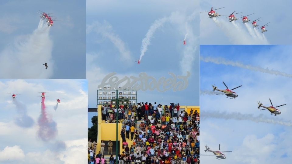 ಮೈಸೂರು : ಬಾನಂಗಳದಲ್ಲಿ ಹಾರುವ ಲೋಹದ ಹಕ್ಕಿಗಳ ಸಾಹಸಮಯ ಪ್ರದರ್ಶನ ನಾಡಹಬ್ಬ ದಸರಾ ಮಹೋತ್ಸವಕ್ಕೆ ಮತ್ತಷ್ಟು ಕಳೆ ತಂದಿದೆ. ಗುರುವಾರ ಬನ್ನಿಮಂಟಪ(ಕವಾಯತು) ಮೈದಾನದಲ್ಲಿ ಹಮ್ಮಿಕೊಳ್ಳಲಾಗಿದ್ದ ವೈಮಾನಿಕ ಪ್ರದರ್ಶನದ ಪೂರ್ವಭ್ಯಾಸದ ರೋಮನಾಚರಣಕಾರಿ ಪ್ರದರ್ಶನವನ್ನು ಕಂಡು ಮೈಸೂರಿನ ಜನತೆ ಕುಣಿದು ಕುಪ್ಪಳಿಸಿದರು. ಸಾರಂಗ ಕೇಂದ್ರ …
